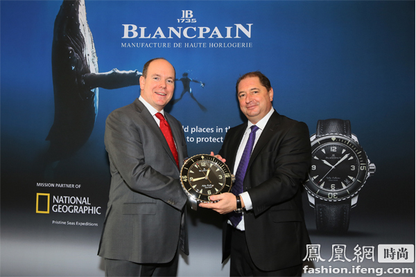 2014年“世界海洋峰会”上,摩纳哥亲王阿尔贝二世(左),宝珀全球副总裁兼市场总监Alain Delamuraz(右)