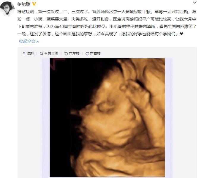 伊能静微博截图 3月18日下午,伊能静晒出二胎宝宝的四维图,宝宝轮廓清晰可见。她透露,高龄妈妈早产可能比较高,医生让六月中下旬做准备。 伊能静写道:“糖耐检测,第一次没过,二、三次过了。营
