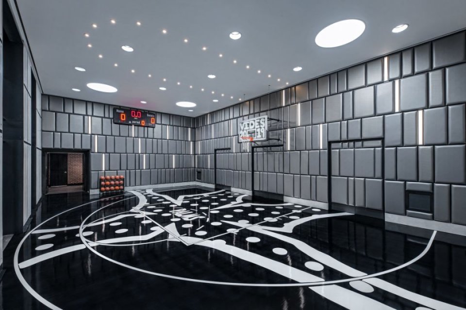 Hardwood 套房,这个房间看起来像一个篮球场其实是隐藏了多个墨菲床的卧室,可以在套房内进行篮球赛,还能举行狂欢派对。(文章来自大风号:普象工业设计小站)