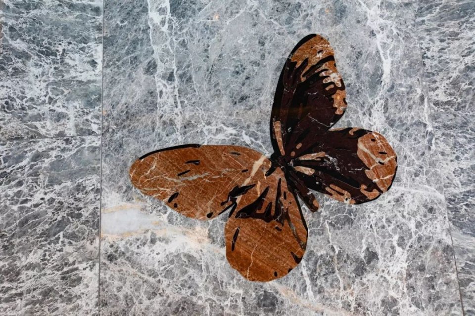 卫生间选用天然大理石铺贴整个空间,地面镶嵌了大理石做的蝴蝶拼花。