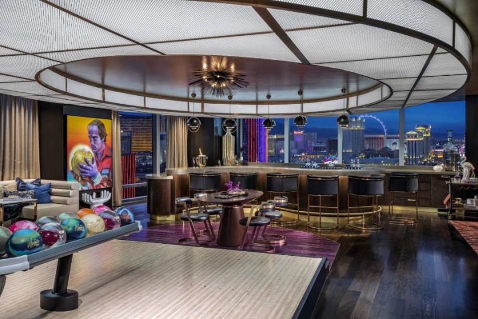 另外的两个套房,还有一些其它夸张的想法,比如Kingpin 套房,是一个以保龄球馆为主题的设计。这两个套房价格从每晚25000 美元(约16万人民币)到50000 美元(约33万人民币)每晚不等。