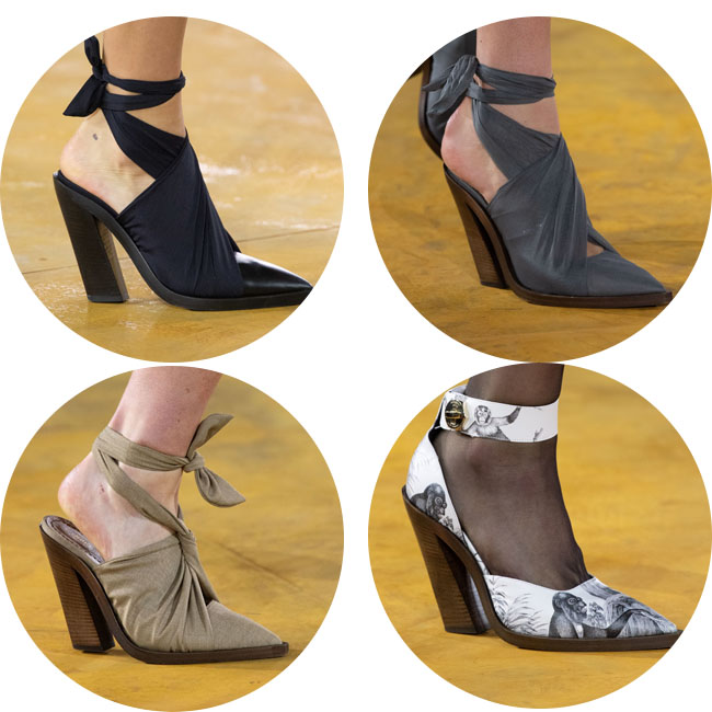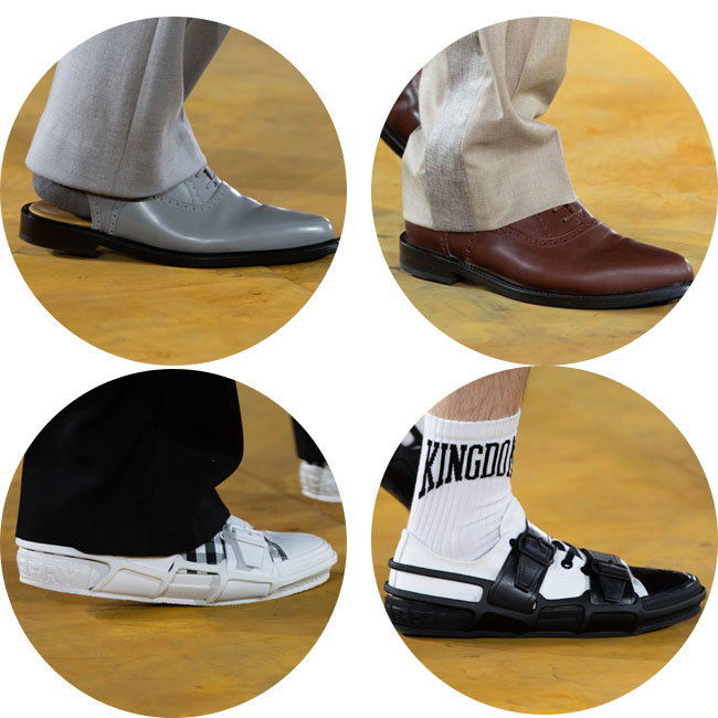 鞋履设计中绑带细节的切尔西靴采用镂空设计,宽大的粗跟便于行走的同时也十分优雅,男士运动鞋方面搭扣的细节前卫的同时也具有街头风。