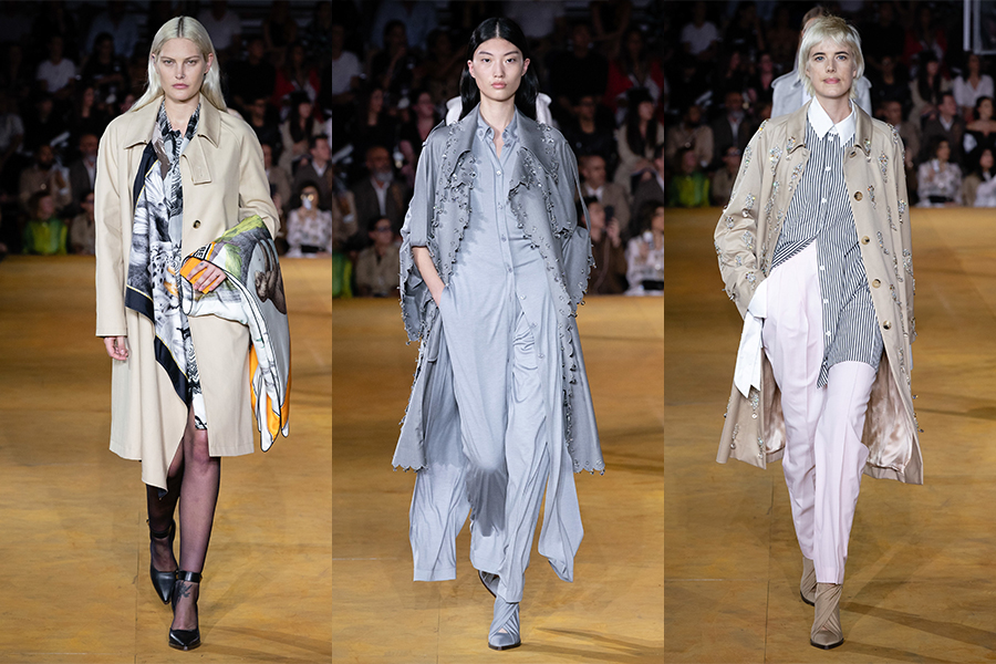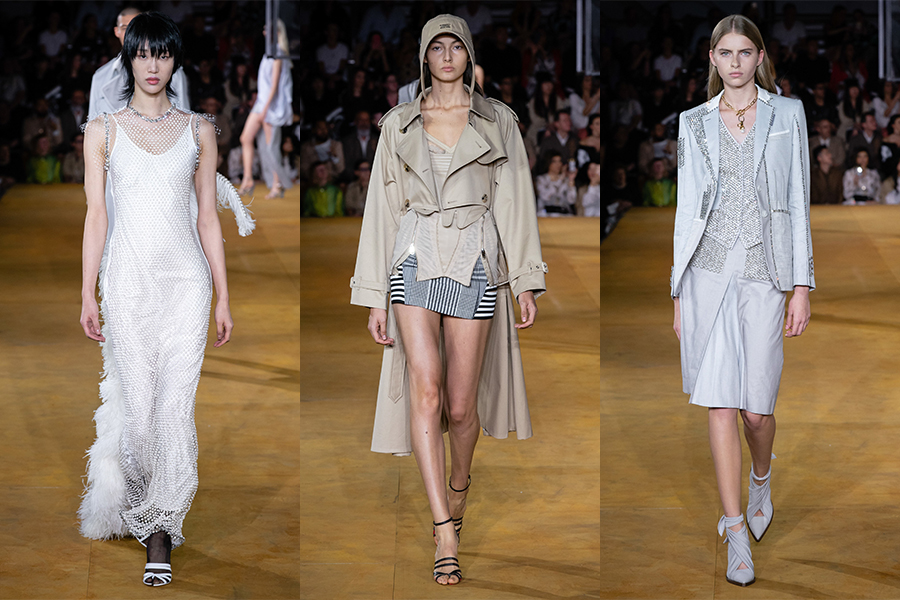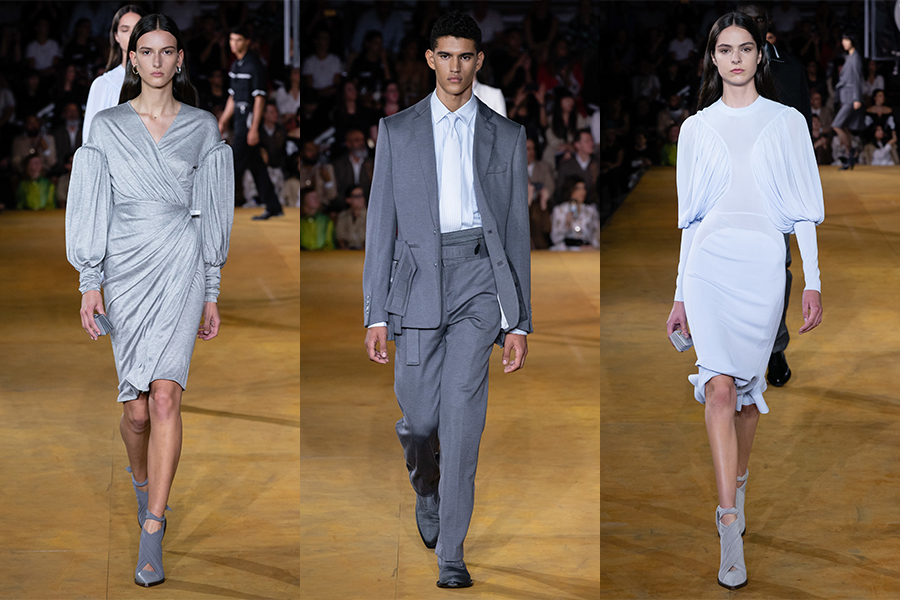 除了女装,Riccardo Tisci的男装风格带着他擅长的街头质感,浅色撞色拼接质地的英伦剪裁西装和风衣,配皮带收腰。带罗纹针织裁片和拉链细节的风雪大衣、连帽衫、橄榄球衫。镂空的格纹府绸衬衫、T 恤和水晶网眼Polo衫,这些游走于男孩与男人之间的态度中和了两种不同风貌。