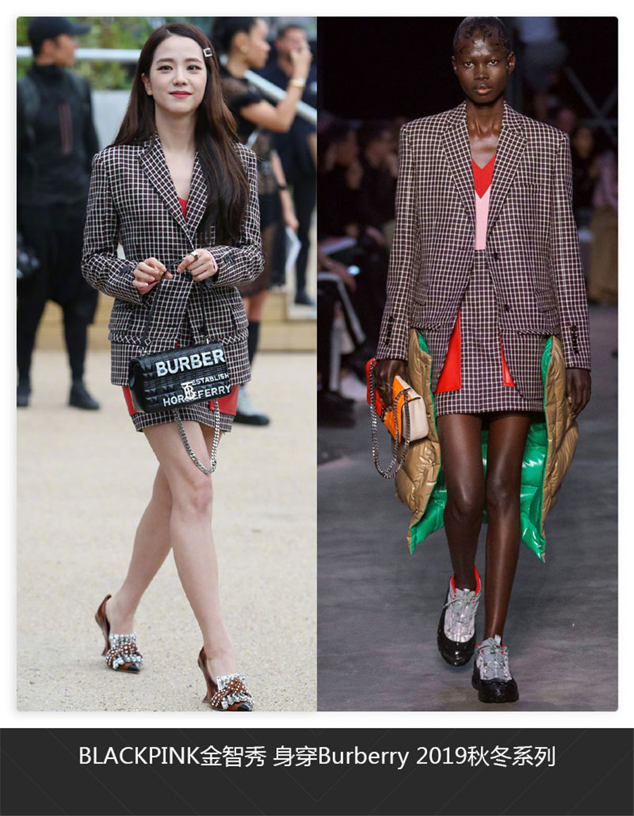 BLACKPINK中的金智秀也出现了,格纹套裙搭配LOGO手提包,繁复的尖头高跟鞋绽放了年轻的独立与优雅。