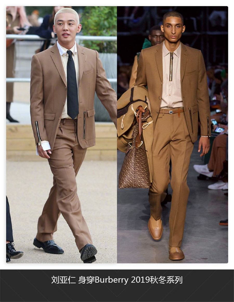 除此之外刘亚仁身穿大地色西装亮相,细节中的金属拉链设计突破了原本西装的刻板印象。