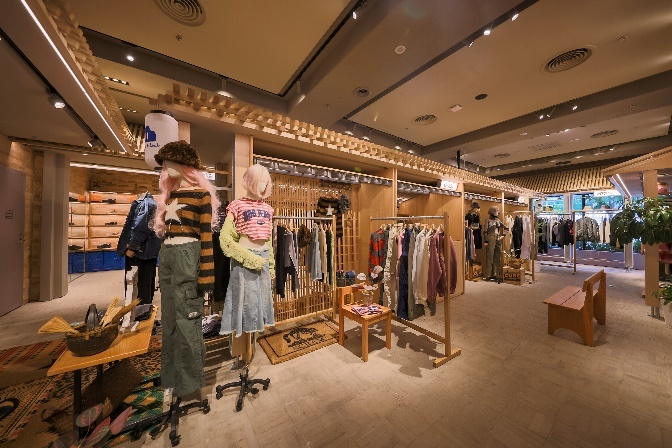店内没有常规地按照性别划分品牌分布楼层,而是将单品轻松地依照生活中不同场景于风格混搭展示,为消费者呈现风格多变兼具实用性的个性穿搭。年轻多变的国潮 :CHOCOOLATE、FIVE CM,韩风的STYLENANDA、LAP与COVERNAT,英伦风的FRED PERRY,日系风 JOURNAL STANDARD , MURUA与EMODA,美式学院风RUSSELL ATHLETIC,带有当下热潮的都市户外风的DANTON、GRAMICCI、MANASTASH,长盛不衰的街头潮牌OBEY、R.R.G.S,Aftermaths,风靡街头的“小袋鼠”KANGOL,风靡全球的棒球帽品牌NEW ERA及潮流鞋区。女装APEE、b+ab、ccaabb、free people涵盖从运动Y2K风、轻淑风到波西米亚民族风,而男装MUSIUM DIV.、ALPHA INDUSTRIES、fingercroxx则为或爱好艺术、或偏心音乐、或中意工装等不同的男生提供标签化服装。