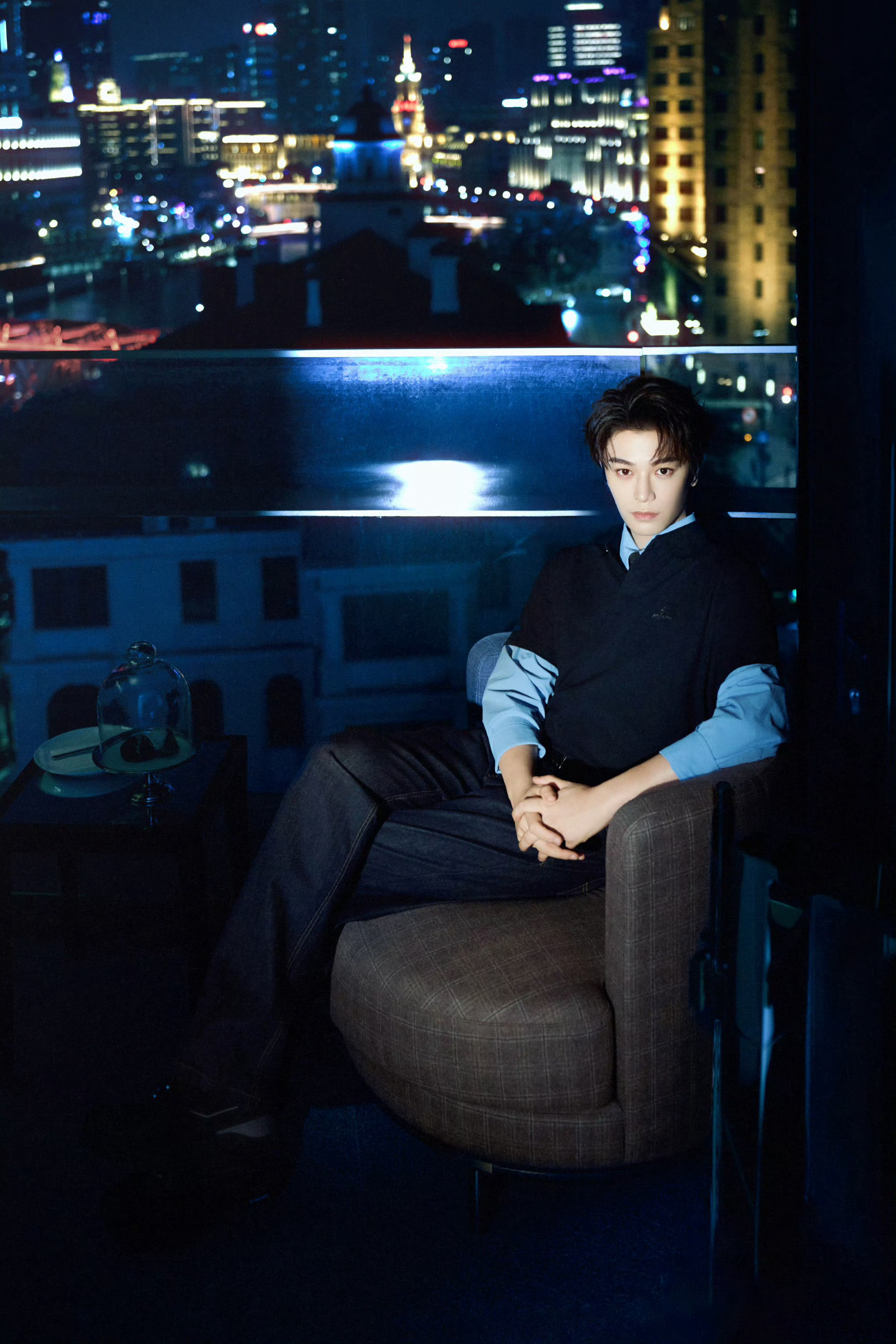丁禹兮昨日出席品牌活动的造型,城市夜景衬出蓝调造型的精英少年气场。