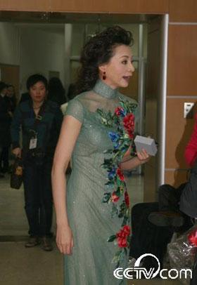 周涛这条美轮美奂兼具有东方水墨画神韵旗袍装,实在令人过目难忘。荷花千年来在国人心目中始终是清白、雅洁、高尚的象征。周涛这条材质现代的旗袍上,正描绘出一幅“荷花花朵艳丽,清香远溢,碧叶翠盖,十分高雅”的意境,更与周涛本人端秀大方的气质相得益彰。