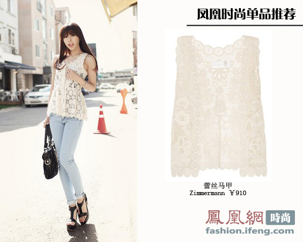 似透非透的白色蕾丝小马甲是夏日的搭配更加清凉,既淑女休闲又不乏性感。贴身的设计令你的身体曲线更加迷人。搭配一条浅色牛仔裤,加上一双黑色罗马鞋回头率爆棚哦。