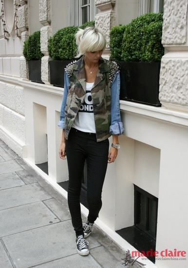 上衣的以最时髦的迷彩、铆钉以及牛仔元素打造出视觉上的“马甲”效果,在简单的T恤与牛仔裤的基础搭配上,有了这么一件必备单品,就足够抢镜。