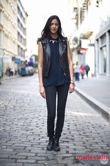即使通身单调的颜色,但是如果在材质上突出变化,还是能显得丰富。比如这身以雪纺衬衣与PU皮马甲呈现出来的对比效果就十分好学,而且很有欧美范儿。![]()